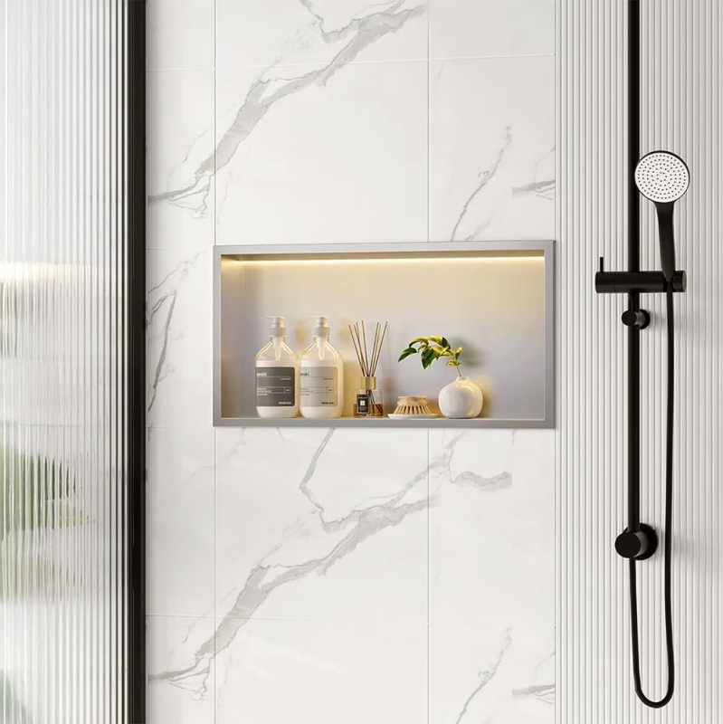 Vstavaná kúpeľňová polica s LED osvetlením je funkčné a estetické riešenie, ktoré sa skvele hodí do sprchy, nad vaňu alebo do inej časti kúpeľne. Vyrobená z vysoko kvalitnej nerezovej ocele Aisi 304, je odolná voči vlhkosti, korózii a intenzívnemu používaniu, a tak si zachová svoj vzhľad po mnoho rokov. Integrovaný Led opasok s výkonom 12 W a farbou svetla 3000K vyžaruje teplé, príjemné svetlo, ktoré dodáva interiéru atmosféru a zároveň zvyšuje pohodlie každodenného používania. Vstavaná montáž vytvára minimalistický a moderný efekt a polica poskytuje pohodlné miesto na uloženie kozmetiky a kúpeľňových doplnkov. Ide o praktický prvok kúpeľňového vybavenia, ktorý spája moderný dizajn, odolnosť a dodatočné osvetlenie, ktoré podčiarkuje eleganciu aranžmánov.
