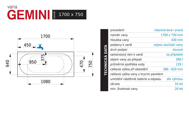 Santech Gemini 1700 x 750 SLIM vaňa-cena je iba za vaňu