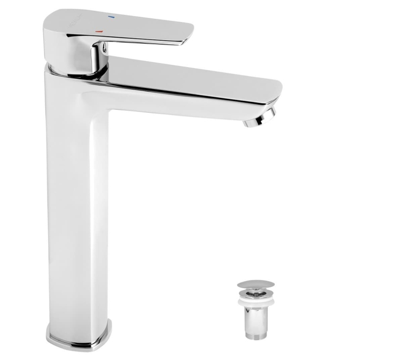 Páková stojanková vysoká umývadlová batéria s výpustou. V chrómovom prevedení. Prietok batérie je 9 litrov/minútu. Výška batérie je 25,7 cm.