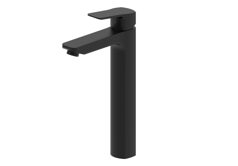 Páková stojanková vysoká umývadlová batéria bez výpuste vo farbe čierna matná. Prietok batérie je 14,2 litrov/minútu. Výška batérie je 30,9 cm. Ramienko je vo výške 24,1 cm. S matným povrchom.