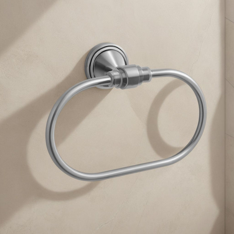 Štýlový vešiak na uteráky v tvare prstenca je praktickým a elegantným doplnkom každej kúpeľne. Je vyrobený z vysoko kvalitnej ocele s povrchovou úpravou z brúsenej ocele a vyznačuje sa odolnosťou proti vlhkosti, korózii a každodennému používaniu. Kruhová konštrukcia umožňuje pohodlné zavesenie uterákov a ryhovaný detail na úchyte dodáva celku moderný charakter. Vešiak sa montuje na stenu, čo šetrí miesto a udržuje poriadok v oblasti umývadla alebo vane. Toto riešenie kombinuje funkčnosť s estetikou, zdôrazňuje interiér a ladí s ďalšími kúpeľňovými doplnkami vo farbe brúsenej ocele.