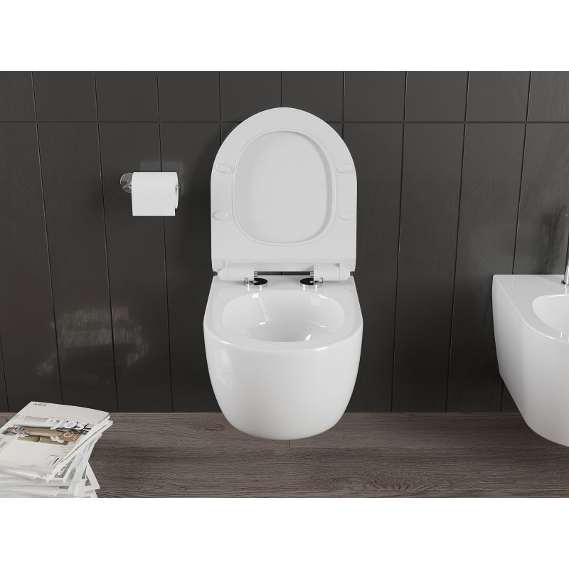 Špecifikácia produktu: Rozmer: 49x36,5x34 cm Inštalácia: Závesná Splachovanie: Bez okraja Tornado Farba: Lesklá biela Materiál: Sanitárna keramika Typ sedátka: S pomalým dovieraním Farba: Lesklá biela Materiál: Duroplast Tenké prevedenie: Áno Jednoduché uvoľnenie: Áno Kovové panty