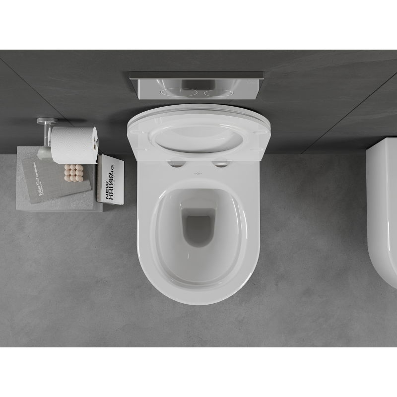 Špecifikácia produktu: Rozmery: 48x36x35, 5 cm Montáž: Závesná Splachovanie: Bez okraja Farba: Lesklá biela Materiál: Sanitárna keramika Typ sedátka: S pomalým dovieraním Farba: Lesklá biela Materiál: Duroplast Tenké prevedenie: Áno Jednoduché uvoľnenie: Áno Kovové pánty: