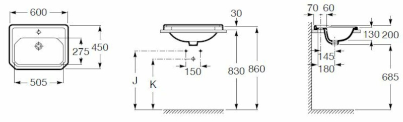 Zápustné umývadlo s otvorom pre batériu uprostred so šírkou 60 cm, hĺbkou 45 cm a výškou 20 cm. Balenie bez sifónu a batérie.