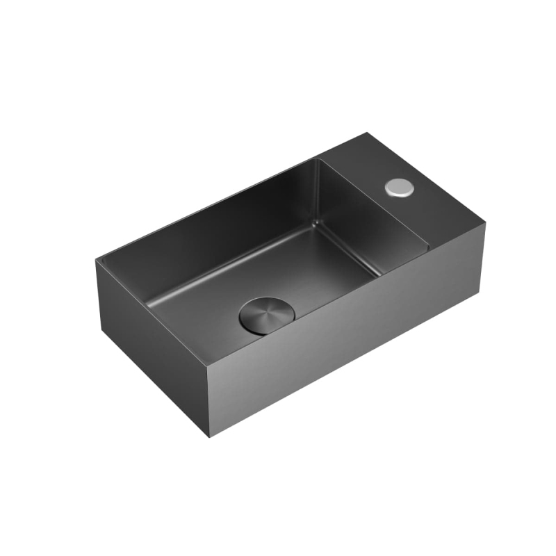 Závesné umývadlo z ocele vo farbe gun metal s tenkými stenami. Súčasťou balenia je odtok v rovnakom odtieni. Sifón ani batéria nie sú súčasťou balenia.