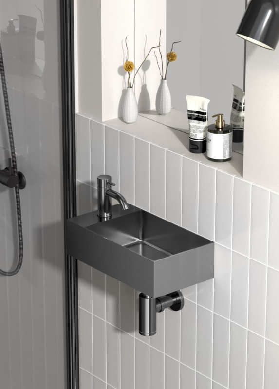 Závěsné umyvadlo z oceli v barvě gun metal s tenkými stěnami. Součástí balení je odtok ve stejném odstínu. Sifon ani baterie nejsou součástí balení.
