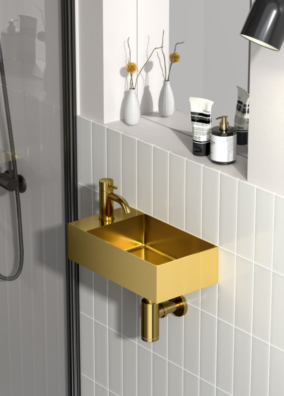 Závěsné umyvadlo z oceli ve zlaté barvě s tenkými stěnami. Součástí balení je odtok ve stejném odstínu. Sifon ani baterie nejsou součástí balení.
