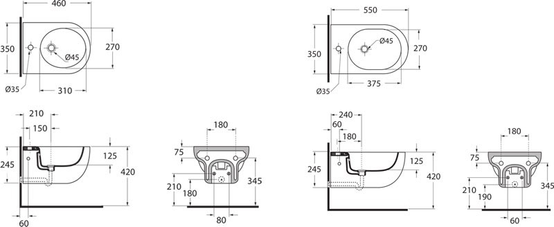 Závěsný bidet NUVOLA - Bez upevňovací sady, 460 x 350 x 245 mm