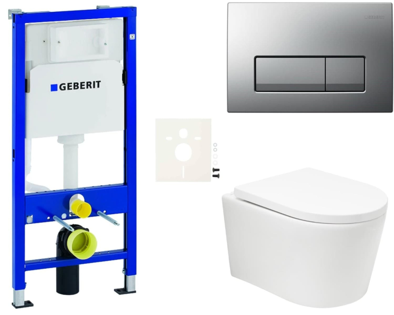 Závesný wc set - sada obsahuje vírové splachovanie, modul do ľahkých stien/predstenová, WC nádržku Geberit, ovládacie tlačidlo SAT a WC sedátko. WC doska je vyrobená z materiálu duroplast. Ovládacie tlačidlo je z materiálu plast a je vo farebnom prevedení chróm mat.