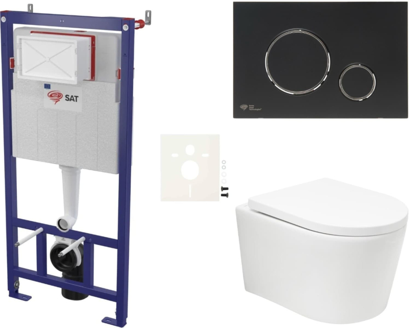 Závesný wc set - sada obsahuje vírové splachovanie, modul do ľahkých stien/predstenová, WC nádržku SAT, ovládacie tlačidlo SAT a WC sedátko. WC doska je vyrobená z materiálu duroplast. Ovládacie tlačidlo je z materiálu plast a je vo farebnom prevedení čierna mat.