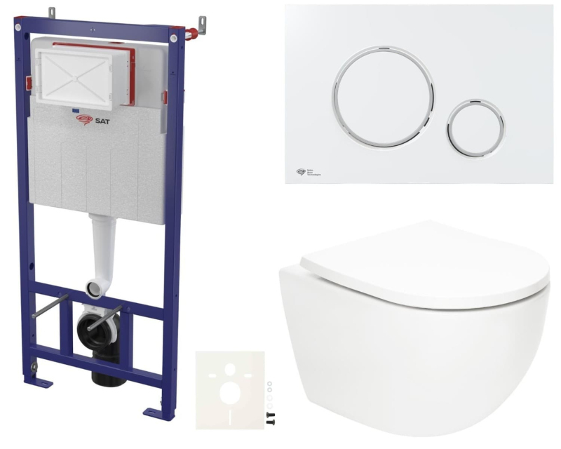 Závesný wc set - sada obsahuje: vírové splachovanie, modul do ľahkých stien/predstenová, WC nádržku SAT ovládacie tlačidlo SAT a WC sedátko. WC doska je vyrobená z materiálu duroplast. Ovládacie tlačidlo je z materiálu plast a je vo farebnom prevedení biela.