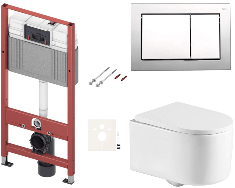 Závesný wc set - sada obsahuje: WC bez splachovacieho okruhu, modul do ľahkých stien/predstenová, WC nádržku TECE, ovládacie tlačidlo TECE nowa, WC sedátko. WC doska je vyrobená z materiálu duroplast. Ovládacie tlačidlo je z materiálu plast a je vo farebnom prevedení chróm lesk.