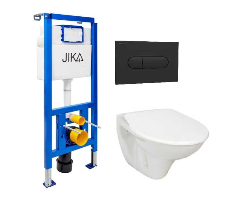 Závesný wc set - sada obsahuje Jika nádržku do ľahkých stien/predstenová, WC sedátko. WC doštička je vyrobená z materiálu thermoplast. Ovládacie tlačidlo je z materiálu plast, a je vo farebnom prevedení čierna matný.