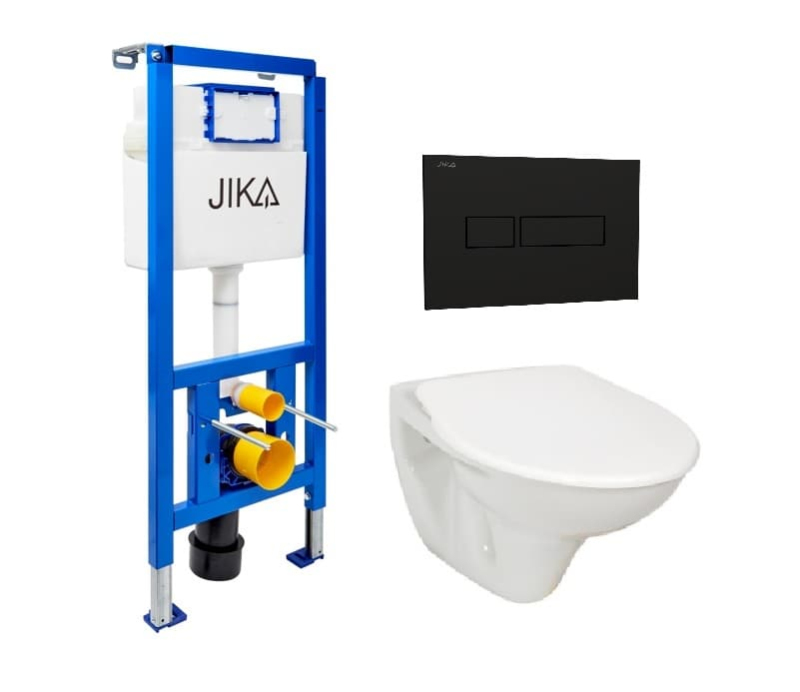 Závesný wc set - sada obsahuje Jika nádržku do ľahkých stien/predstenová, WC sedátko. WC doštička je vyrobená z materiálu thermoplast. Ovládacie tlačidlo je z materiálu plast, a je vo farebnom prevedení čierna matný.