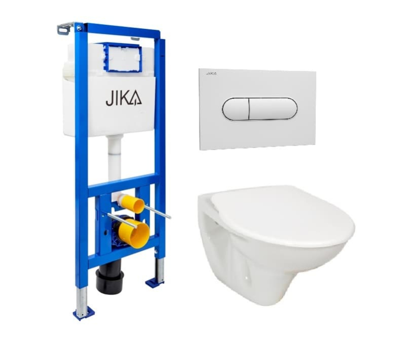 Závesný wc set - sada obsahuje Jika nádržku do ľahkých stien/predstenová, WC sedátko. WC doštička je vyrobená z materiálu thermoplast. Ovládacie tlačidlo je z materiálu plast, a je vo farebnom prevedení biela.