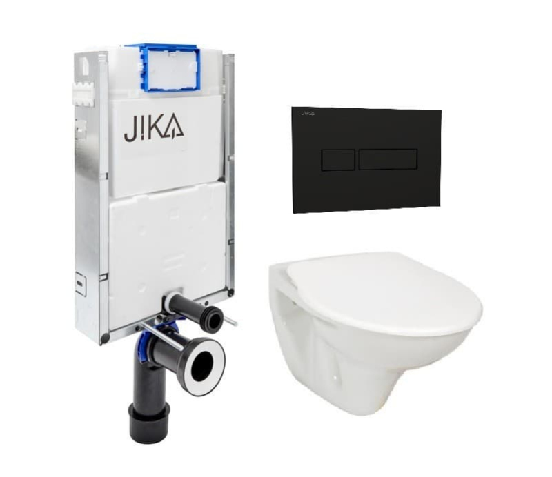 Závesný wc set - sada obsahuje: Jika modul na zamurovanie, WC sedátko. WC doštička je vyrobená z materiálu thermoplast. Ovládacie tlačidlo je z materiálu plast, a je vo farebnom prevedení čierna matná.