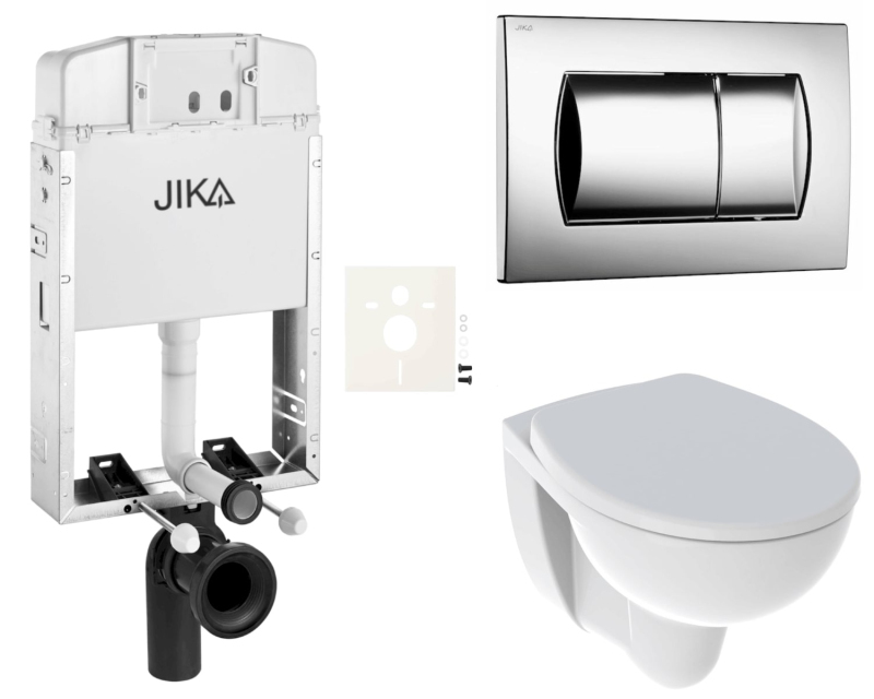 Závesný wc set - sada obsahuje: WC bez splachovacieho okruhu, modul na zamurovanie, WC nádržku Jika a WC sedátko. WC doska je vyrobená z materiálu duroplast. Ovládacie tlačidlo je z materiálu plast a je vo farebnom prevedení chróm lesklý.