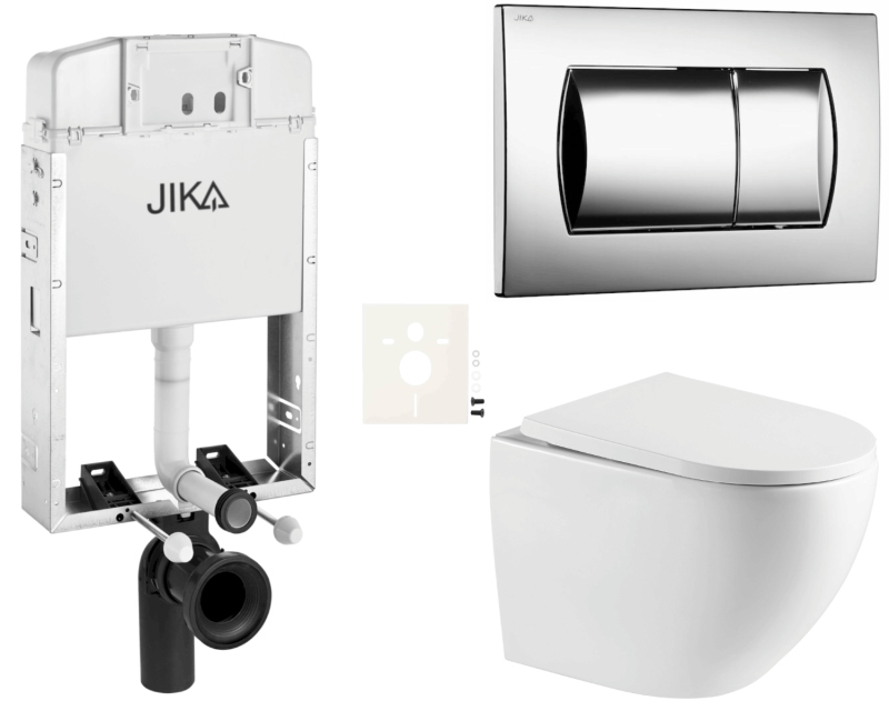 Závesný wc set - sada obsahuje: WC bez splachovacieho okruhu, modul na zamurovanie, WC nádržku JIKA a WC sedátko. WC doska je vyrobená z materiálu duroplast. Ovládacie tlačidlo je z materiálu plast a je vo farebnom prevedení chróm lesk.