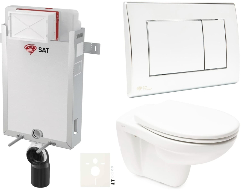Závesný wc set - sada obsahuje modul na zamurovanie, WC nádržku SAT ovládacie tlačidlo SAT a WC sedátko. WC doska je vyrobená z materiálu duroplast. Ovládacie tlačidlo je z materiálu plast a je vo farebnom prevedení chróm lesk.