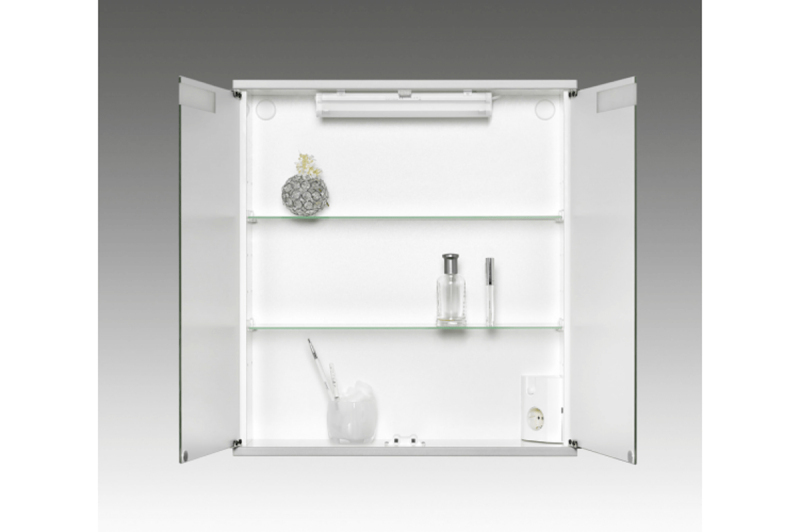 Zrkadlová skrinka s osvetlením so zásuvkou o rozmere 60x65x14 cm. Galerka má 2 poličky.