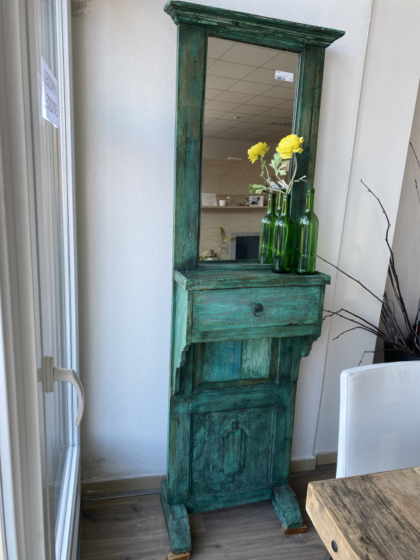 Toto jedinečné zrkadlo v sebe nesie príbeh starých indických domov, kde kedysi slúžilo ako dvere. Jeho drevený rám, bohatý na detaily as autentickou zelenou patinou, dodáva interiéru nádych exotiky a rustikálnej elegancie. Každý kus je originál s vlastným charakterom, ktorý prináša do priestoru nielen praktickú funkciu, ale aj kus histórie ďalekých krajín.
