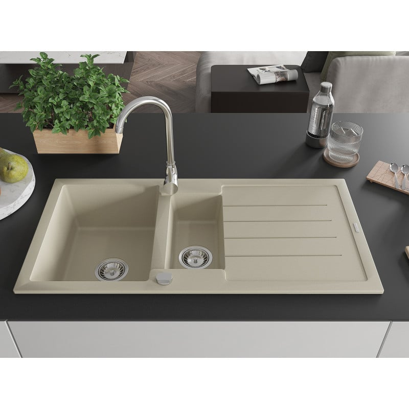 Žulový drez Mexen Andres 1,5 drezu s odkvapkávačom 1000 x 500 mm, béžový, chrómovaný sifón - 6515101510-69