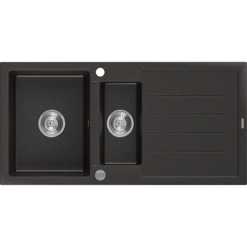 Špecifikácia produktu: Rozmer: 1000x500x200 mm Hĺbka drezu: 190 mm (väčšia), 115 mm (menšia) Rozmery drezu: 430x330 mm (väčšia), 340x170 mm (menšia) Priemer odtoku: ø90 mm Typ: 1,5 Farba: Čierna/zlatá metalíza Povrchová úprava sifónu: Chróm Otvor pre prepad: Áno Otvor pre batériu: Áno Automatický sifón súčasťou balenia Vysoká odolnosť proti poškriabaniu a zmene farby Odolnosť voči teplotným šokom Ľahko čistiteľný povrch