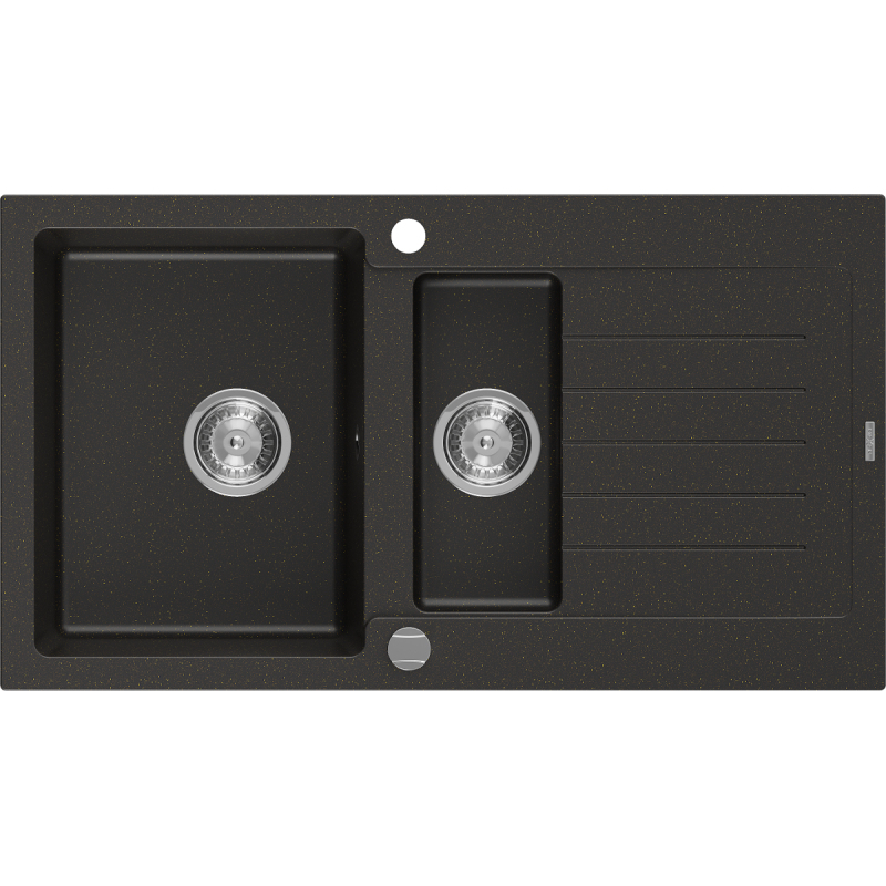 Žulový drez Mexen Matias 1,5 drezu s odkvapkávačom 900 x 505 mm, čierna/zlatá metalíza, chrómovaný sifón - 6502901505-75
